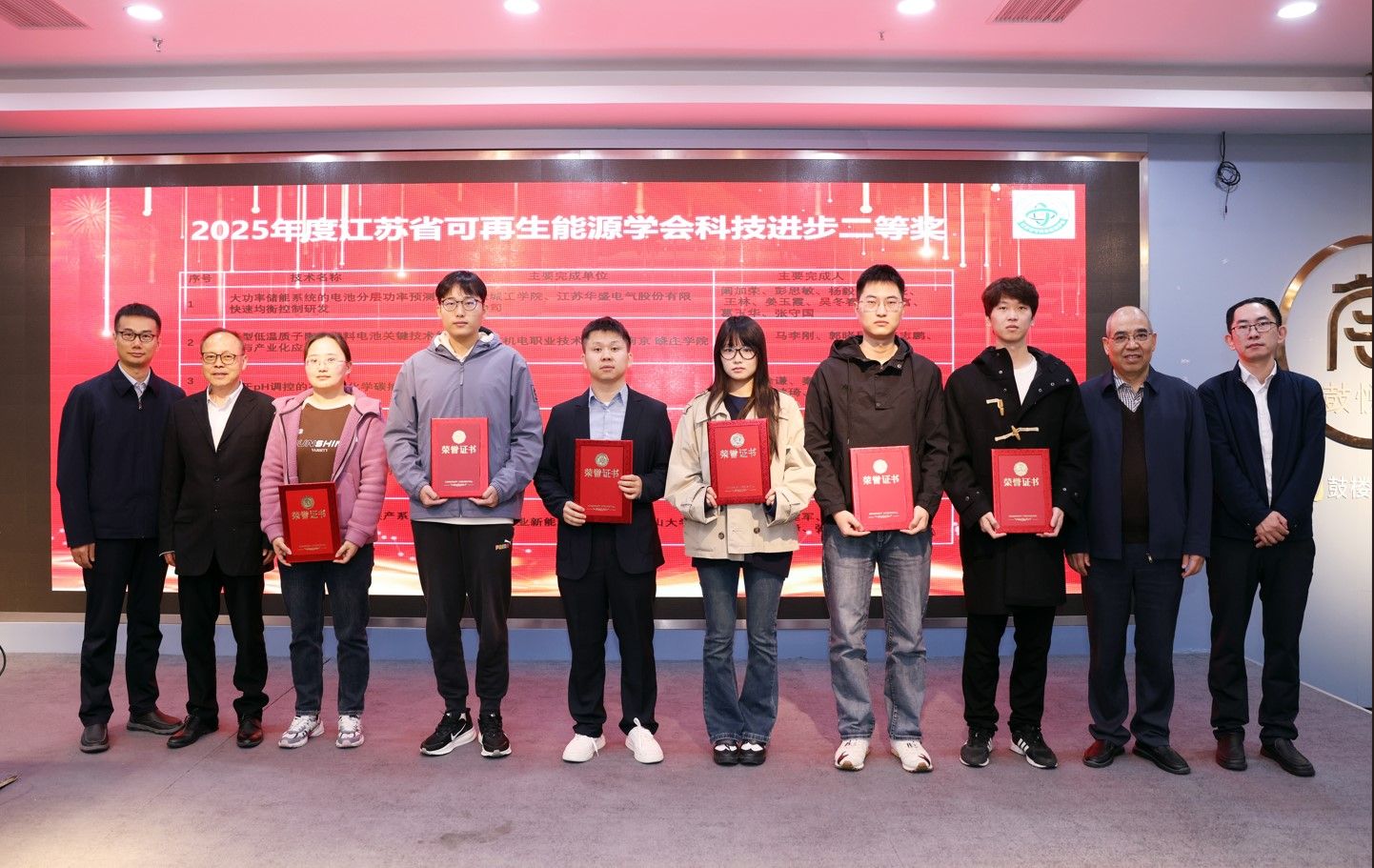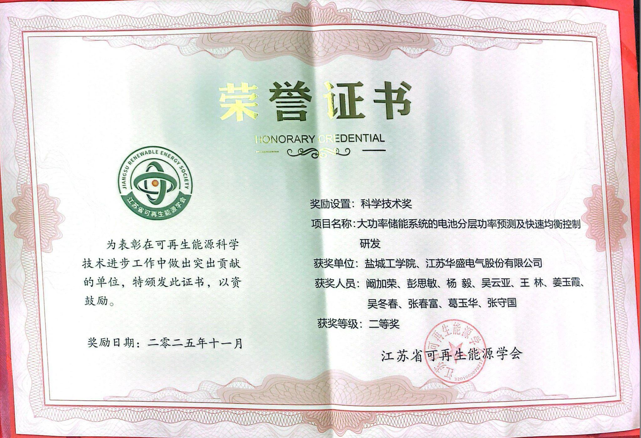 开幕式后举行的 2025 年度江苏省可再生能源学会颁奖仪式上,由阚加荣和彭思敏教授联合申报的成果 “大功率储能系统的电池分层功率预测及快速均衡控制研发” 荣获科学技术二等奖。该成果针对储能系统核心技术瓶颈的突破,为大功率储能装备的安全高效运行提供了关键解决方案,凸显了学院科研团队在储能领域的创新能力。