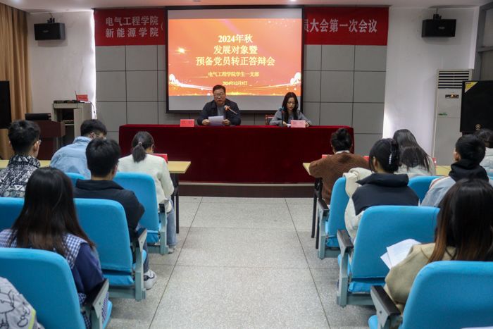 12月5日晚,在南校区怀德楼三楼报告厅,电气工程学院学生一支部召开2024年秋发展对象暨预备党员转正答辩会。学院党委副书记江滔出席并指导工作。学工办主任于晨颖,团委书记、纪检委员单曼曼,学生一支部宣传委员冯程程、组织委员张朋蕴,本科生辅导员王怀鹏,及15名待转正预备党员、22名拟发展对象参加。活动由支部书记凌悦主持。