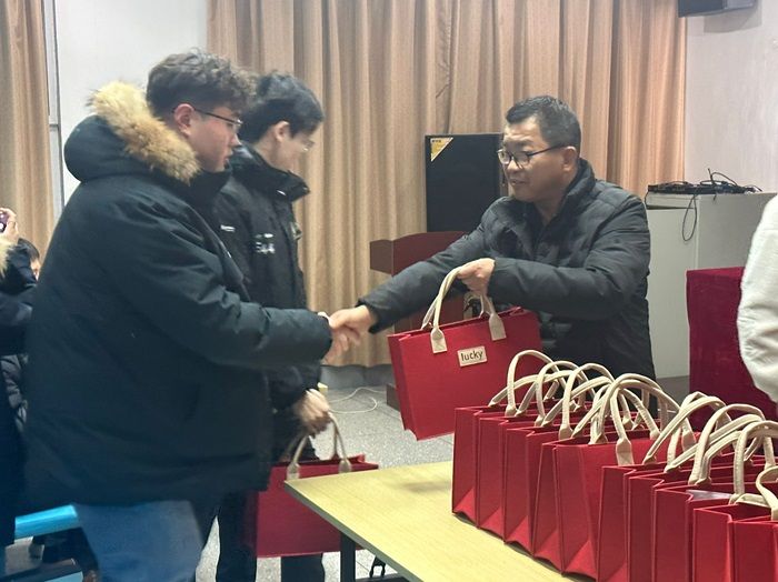 与会领导与老师向同学们送上“考研加油包”,礼包中包含脐橙、旺仔牛奶、巧克力、薯愿薯片、暖贴,寓意“一战橙硕”、“万事皆旺”、“巧克难题”、“如你所愿”,表达了学院对考研学生的美好祝愿。