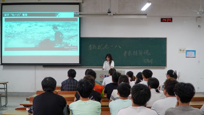 以史为鉴:沉浸式学习“九一八”历史。学生会实践部部长朱思羽以“还原历史真相,传承抗争精神”为核心,梳理了“九一八”事变的历史脉络——从柳条湖事件的导火索,到东北沦陷的屈辱历程,再到中华民族奋起反抗的壮阔图景。讲述中,泛黄的历史照片缓缓切换:北大营士兵仓促抵抗的身影、东北民众扶老携幼逃亡的惨状、抗日联军雪地行军的坚毅足迹……,将现场同学带回那个山河破碎的年代,沉浸式感受风雨如晦的岁月。历史讲解落幕,“著名战役抢答”环节随即开启。“中国军队打响抗日第一枪的战役是?”“淞沪抗战中,哪支部队曾坚守四行仓库?”朱思羽围绕江桥抗战、淞沪抗战、长城抗战等关键战役,以及杨靖宇、赵尚志等英雄人物出题,话音刚落,同学们便纷纷举手,有的快速报出答案,有的补充战役细节,在互动中深化大家对历史的认知。