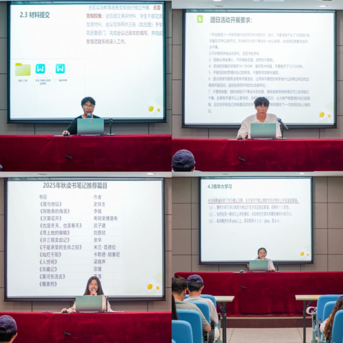 学院团委活动部部长杨紫微同学重点明确了读书笔记、团日活动感想及“青年大学习”的考核细则与提交要求,同时补充说明读书笔记的具体评分标准、推荐书目清单,以及团日心得的审核流程。