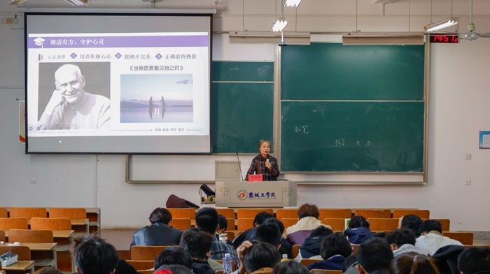 韦春华围绕大学生心理健康教育主题,以“大学新貌,梦想起航”为开篇,先向我们展示了学校的风采与独特魅力,然后与同学们进行了一个叉手游戏,引出“适应”这一话题,通过引入进化论与进化心理学理论,深入浅出地阐释“适应是生产与发展的必然过程”,帮助大家以科学视角看待心理适应的过程。在“调试有方,守护心灵”板块,韦主任通过一个事例,分享了诸多实用的方法,教我们如何进行心态调整,可以从培养积极心态、接纳不完美、正确看待挫折三个方面来调节自己。最后教我们从不同方面探索自己,确立奋斗目标,做好生涯规划。