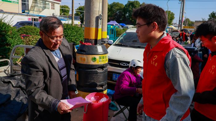 志愿者同学们走进社区菜市场,精准锁定商户群体开展反诈宣讲,他们聚焦“虚假订单诈骗”“冒充执法人员收费”“二维码盗刷”三类高频涉经营类诈骗,用案例拆解诈骗套路。为扩大宣传覆盖面,志愿者分为多个行动小组。各小组在组长带领下开展逐户走访,不仅为每户商户送上反诈宣传手册,还现场演示实用防护技巧,包括如何快速辨别虚假订单信息、怎样做好收款二维码的安全防护等,手把手帮助商户提升反诈能力。
