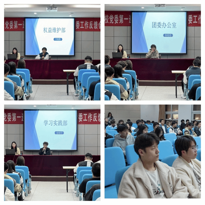 会上,学团各部长对当前阶段的工作进行总结。团委办公室部长陈铭亮从团日活动的开展、读书笔记的考核标准展开,强调各班要认真对待团日活动思想汇报的总结工作;学习实践部全向宁表示,开学来大一各班的晚自习考勤情况不乐观,为帮助大一树立良好的学风,后续会加大晚自习出勤检查力度;权益维护部万俊凯指出班级建设大赛中各班存在的问题,并希望各班在决赛中能遵守纪律。