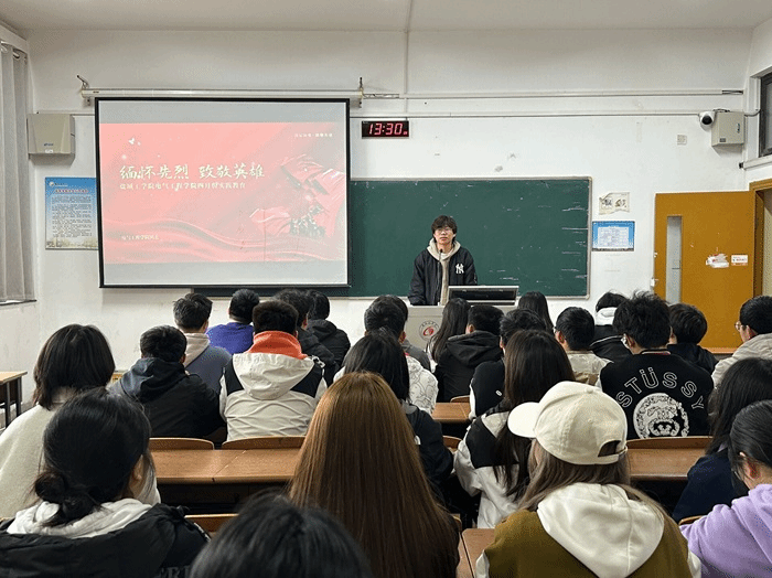 铭记历史,致敬英雄。团委办公室部长陈铭亮作题为《缅怀先烈,致敬英雄》的主题团课。他围绕清明节的历史、习俗和文化内涵展开介绍,带领大家走进相关传统文化,传承历史记忆。陈铭亮表示:“清明扫墓不仅是纪念自己的祖先,更应该铭记历史,致敬英雄。”随后,通过学习先烈黄继光、董存瑞、邱少云和刘胡兰等英雄的故事,同学们深刻认识到:“一个有希望的民族不能没有英雄,一个有前途的国家不能没有先锋。”