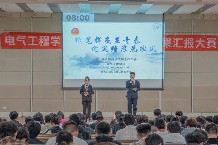 为深入开展学院班级争优创新实践活动,进一步加强班级组织建设和凝聚力建设,展示班级组织的工作业绩和青年学生的精神风貌,4月17日晚,在北校区化工楼报告厅,电气工程学院第十届“执笔挥毫写青春,迎风踏浪展班风”主题班级建设大赛决赛圆满举办。电气工程学院党委书记于建业、副院长阚加荣、所有专职辅导员以及学生代300余人参加。入围决赛的9个班级代表队分别通过PPT汇报和舞台展示两个环节依次进行班级成果展示。在PPT汇报中,各班级紧扣班风建设、学风建设、风采建设等几大模块,从班级组织、学习氛围、集体活动、成员风采等方面展示自己班级的独特文化和丰硕成果。