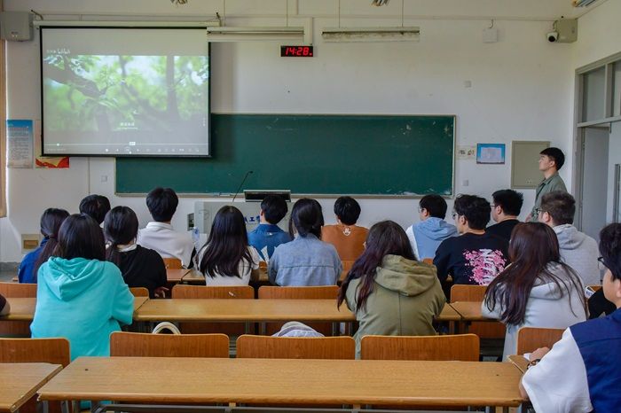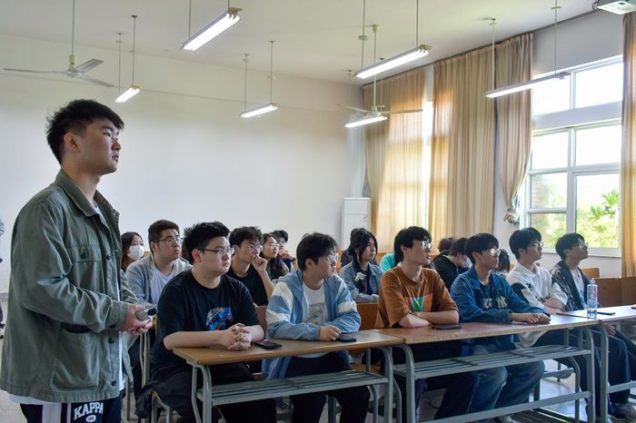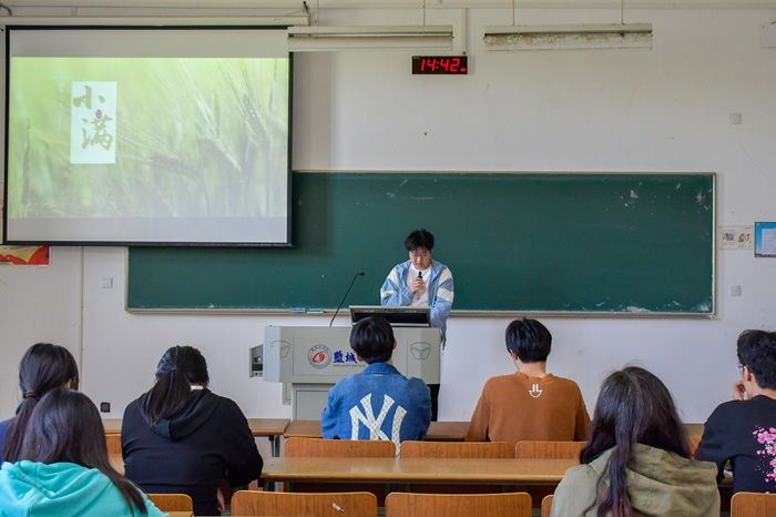 活动开始,团委办公室副部长薛成俊作题为《万物小得盈满,美好恰逢其时》的主题团课。他带领同学们了解小满的由来、历史背景、农事活动、与小满相关的传统习俗、小满时节的养生知识、小满在文化传承中的重要性等。随后,邀请现场同学上台分享对小满节气的认识和对传统文化的感受,并发放信纸展开互动,同学们自主创作小满古诗词,并进行作品的展示与交流,在互动中回顾小满节气知识,进一步感受此次活动的内涵。