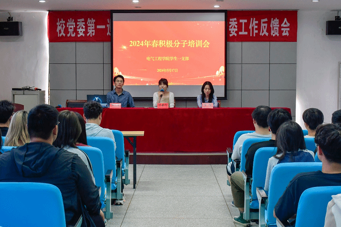 5月17日晚上,在南校区怀德楼报告厅,电气工程学院开展2024年春学期入党积极分子培训。开班仪式由学生一支部书记张馨月主持,组织委员杨立远、辅导员凌悦以及2024年春学期入党积极分子培训班学员参加。