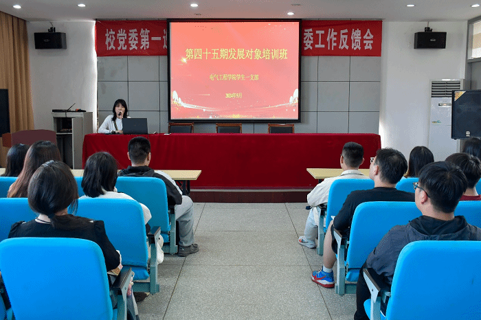 5月22日晚,在南校区怀德楼三楼报告厅,电气工程学院学生一支部开展第四十五期发展对象培训活动。支部书记张馨月主持,学院32名本硕学生发展对象参加。