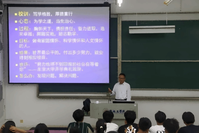 课堂上,各位系主任对新生表示欢迎和祝福并结合自身多年丰富的教育教学、科学研究工作实际经验,为同学介绍和分享了本专业的前沿知识、就业前景、课程概要、职业规划及响应时代号召下学院教学重心的转移。在与同学互动交流时,各位主任一一回答了同学们的疑问困惑,希望大家在四年本科学习阶段多思考、多提问、多实践,努力提升个人专业能力、拓展学科视野、建立多元知识储备。最后,各位主任鼓励同学们进一步增强自主学习能力,努力学好专业知识,积极参与各级各类学科竞赛,为高质量就业和进一步深造打好基础、做好铺垫。课堂接近尾声,老师们从增强自我教育、自我管理、自我服务的能力等方面对新生做出要求,希望新生踏入校园之际就能认知大学、感悟大学、融入大学、享受大学。
